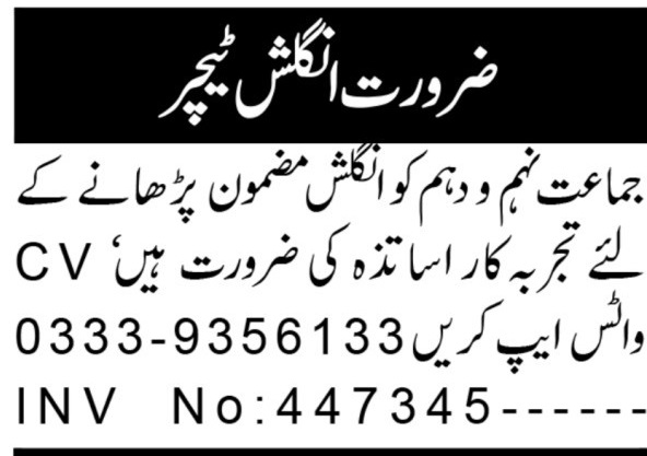 Vacant posts including english teacher and teacher are announced in Private School Peshawar, peshawar Khyber Pakhtunkhwa KPK Pakistan as per 24 November 2025 advertisement in daily Aaj Newspaper. Educational qualifications required BA and Bachelor etc.