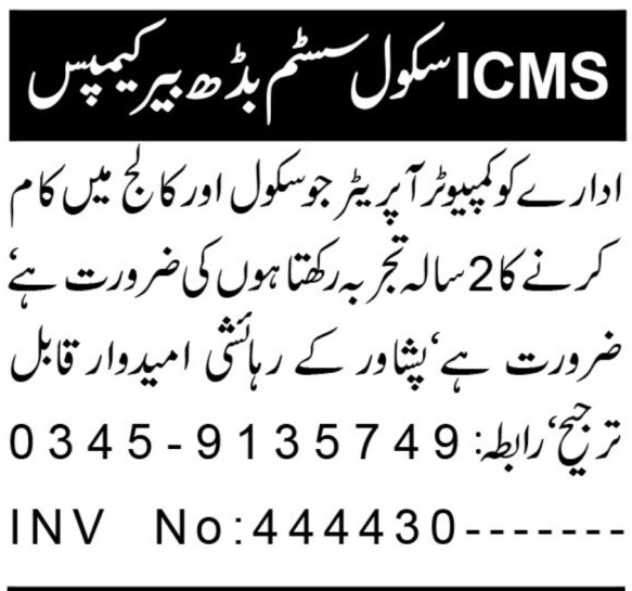 Vacant posts including computer operator are announced in ICMS School System Peshawar, peshawar Khyber Pakhtunkhwa KPK Pakistan as per 25 August 2025 advertisement in daily Aaj Newspaper. Educational qualifications required Intermediate, Bachelor and BA etc.
