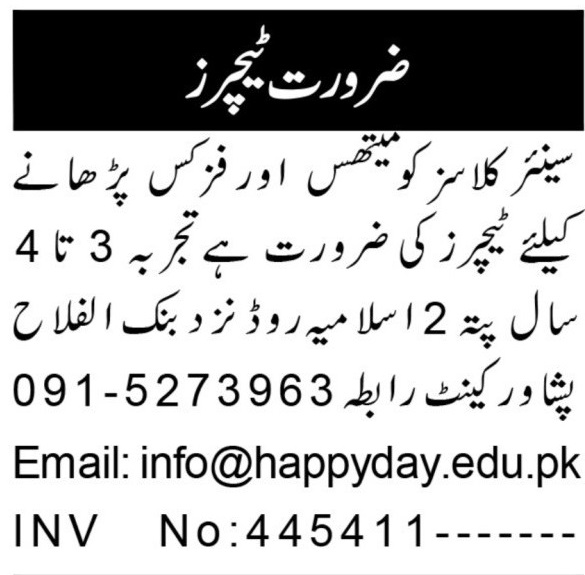 Happyday School System HSS invites applications for job positions advertised in daily Aaj dated 29 September 2025 for following vacancies in Cantt Peshawar, peshawar Khyber Pakhtunkhwa KPK Pakistan.