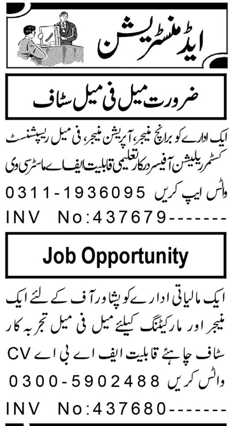 Private Company Peshawar, peshawar Khyber Pakhtunkhwa KPK Pakistan invites applications from eligible candidates for the post of marketing manager, customer relation officer, receptionist, female receptionist, branch manager, manager and operation manager as per advertisement of December 30, 2024 published in daily Aaj Newspaper. Candidates with BA, Intermediate, Master and Bachelor etc. educational background will be preferred.
