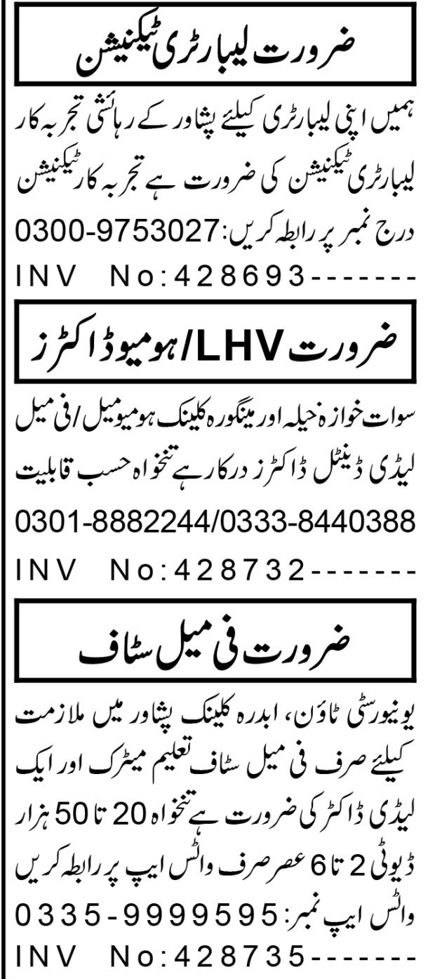 Hospital Clinic Peshawar, mingora, peshawar and swat Khyber Pakhtunkhwa KPK Pakistan invites applications from eligible candidates for the post of laboratory technician, technician, homeopathic doctor, lhv and dental doctor as per advertisement of February 5, 2024 published in daily Aaj Newspaper. Educational qualifications required Others, Bachelor, Matric, MBBS and Intermediate etc.