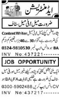Vacant posts including office staff, manager, female manager and content writer are announced in Private Company Peshawar, peshawar Khyber Pakhtunkhwa KPK Pakistan as per 9 December 2024 advertisement in daily Aaj Newspaper. Intermediate, Bachelor and BA etc. educational qualification will be preferred.