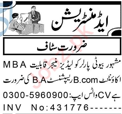 Beauty Parlor invites applications for job positions advertised in daily Aaj dated 10 June 2024 for following vacancies in Peshawar, peshawar Khyber Pakhtunkhwa KPK Pakistan.