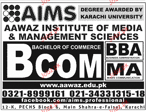 Aawaz Institute of Media & Management Science Admission in BCom, BBA and MA in karachi Read newspaper ad for exact details.