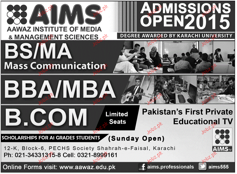 Aawaz Institute of Media & Management Sciences Admission in BS, MA, BBA, MBA and B.Com in Karachi. Read newspaper ad for exact details.