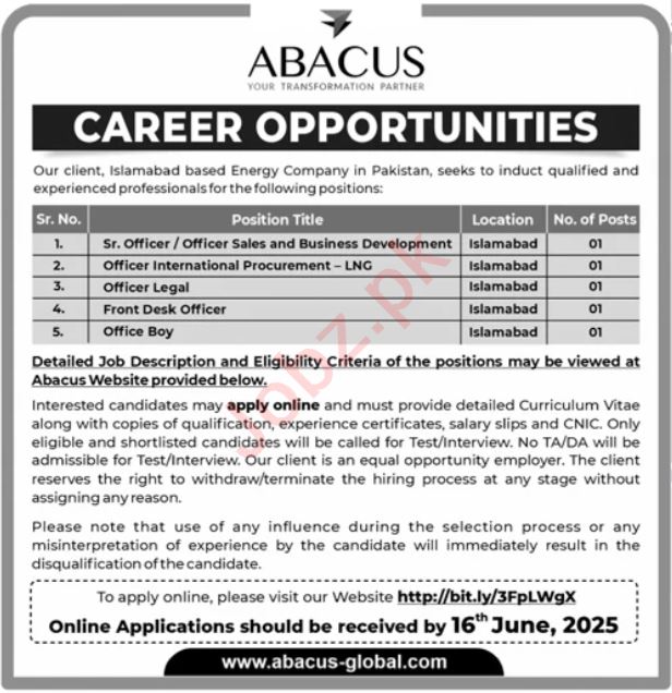 Abacus Global is looking for candidates for following posts as per job advertisement published in daily Jang Newspaper of June 1, 2025 for location Shahrah-e-Faisal Karachi, karachi Sindh Pakistan: