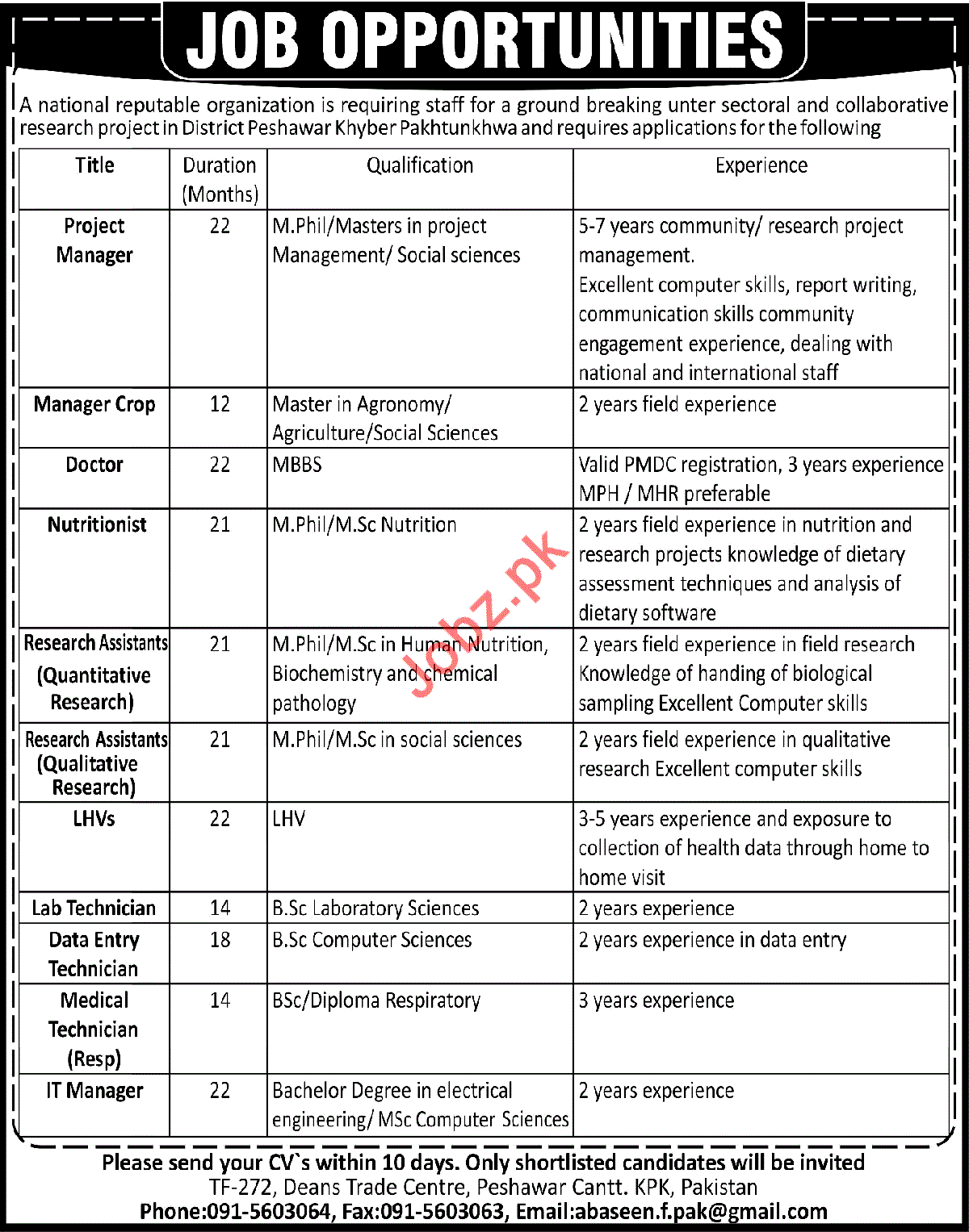Abaseen Foundation Peshawar is looking for Project Manager, Manager Crop, Doctor, Nutritionist, Research Assistant, Quantitative Research, Research Assistant, Qualitative Research, LHV, Lab Technician, Data Entry Technician, Medical Technician, IT Manager in Peshawar.