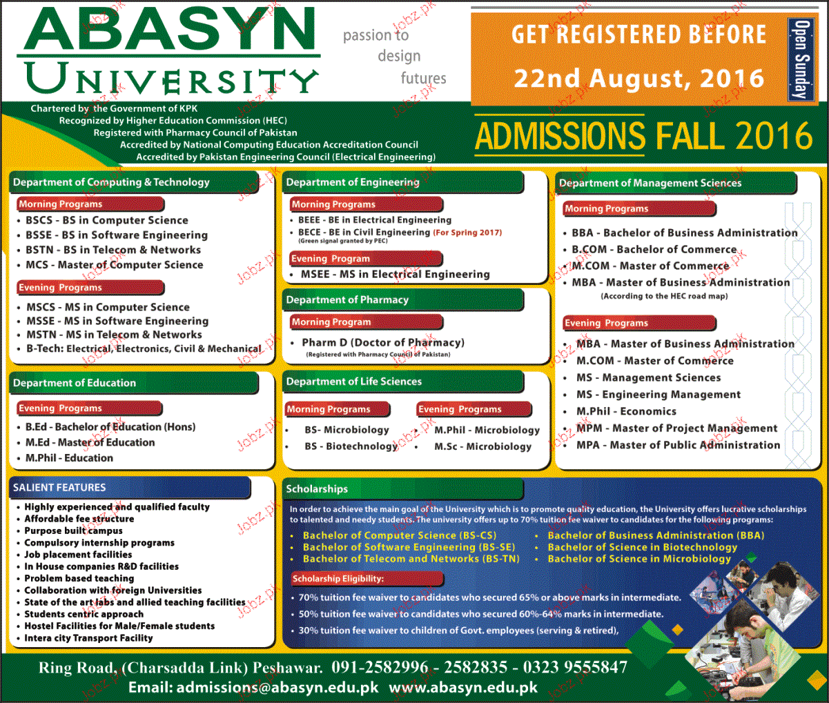 Abasyn University Admission in BE, BS, MS and BBA in Peshawar. Read newspaper ad for exact details.