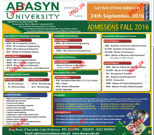 Abasyn University Admission in BSCS, MSCS, BBA and B.Com in Islamabad. Read newspaper ad for exact details.