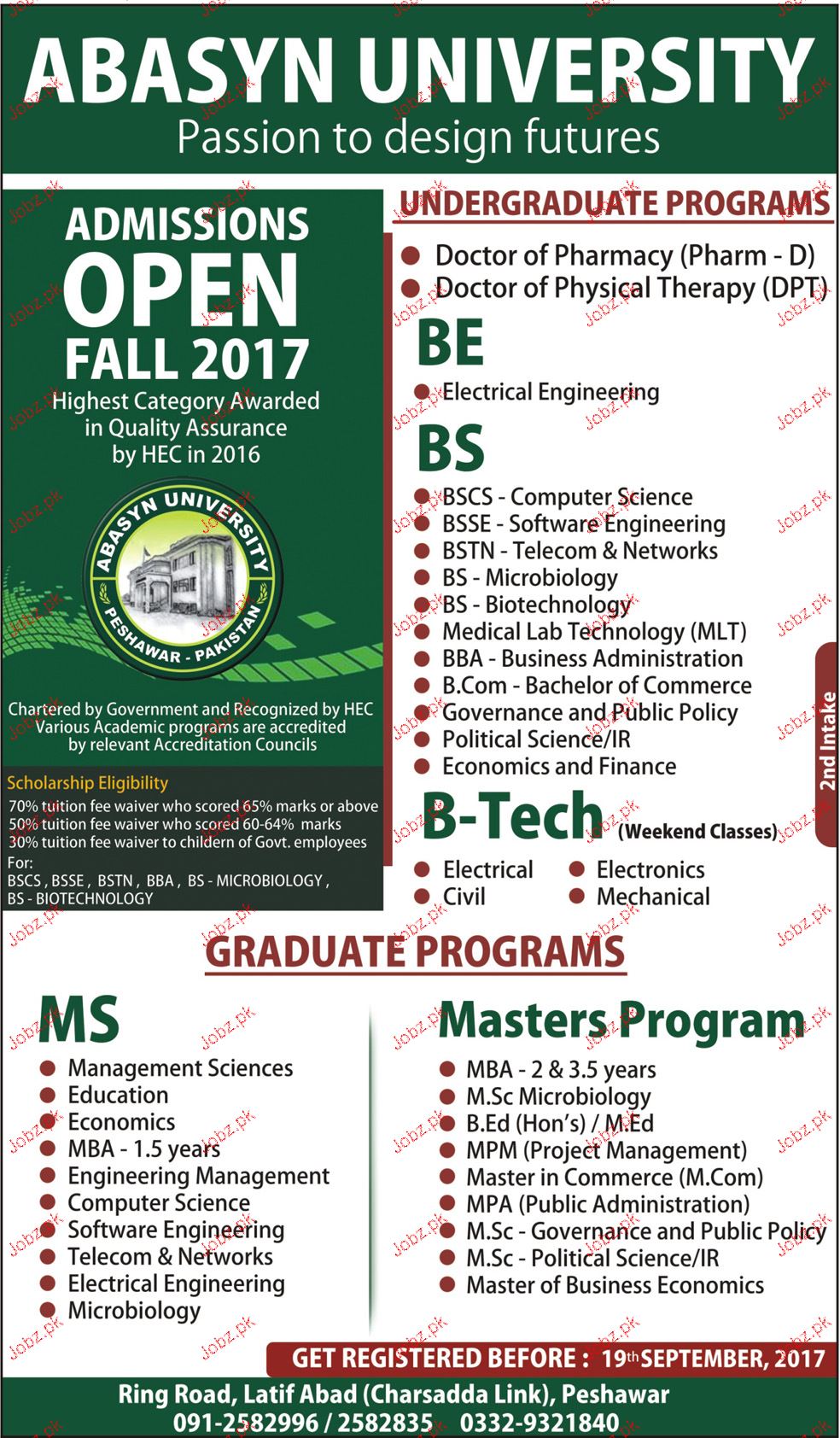 Abasyn University Admission in MS, BE, B.Tech and Phd in Peshawar. Read newspaper ad for exact details.