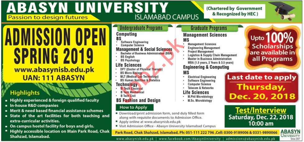Abasyn University Islamabad, Pakistan are started admissions spring 2019 for BS & MS (Computer Science & Engineering), M Phil, PhD, B Tech (Electrical, Mechanical, Civil). Read newspaper ad for exact details.