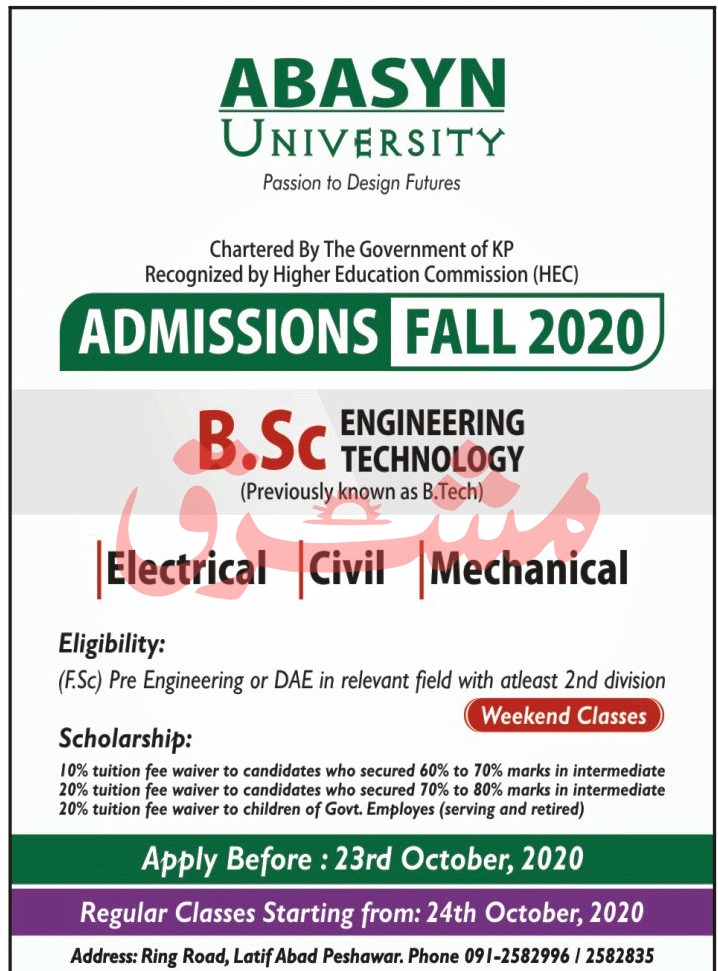 Abasyn University chartered by Government of Khyber Pakhtunkhwa Recognized by Higher Education Commission HEC is offering admissions in BSc Engineering Technology. Read newspaper ad for exact details.