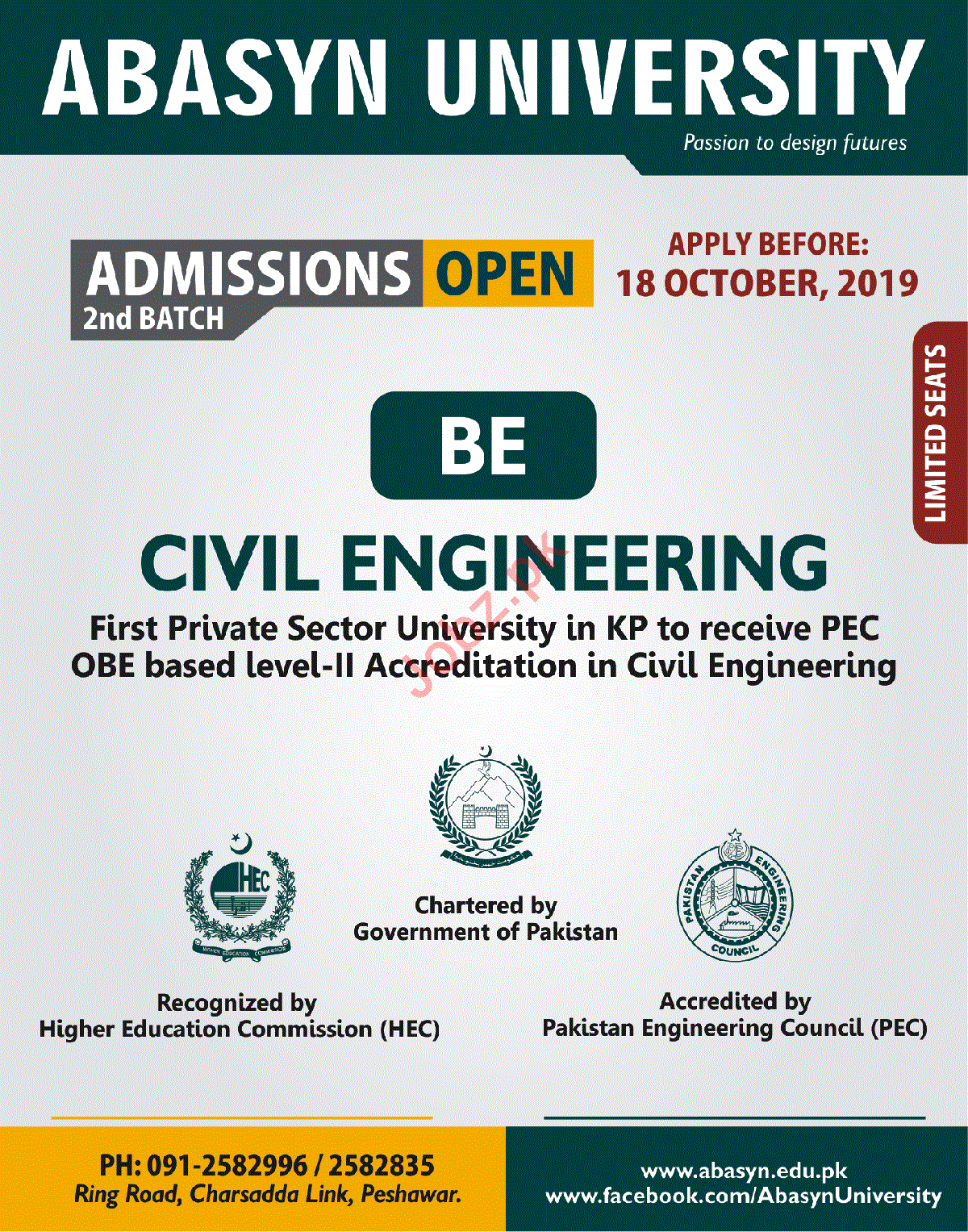 ABASYN University Islamabad is offering admissions in BE Civil Engineering in Islamabad. ABASYN University is recognized by Higher Education Commission HEC and Accredited by Pakistan Engineering Council PEC. Read newspaper ad for exact details.