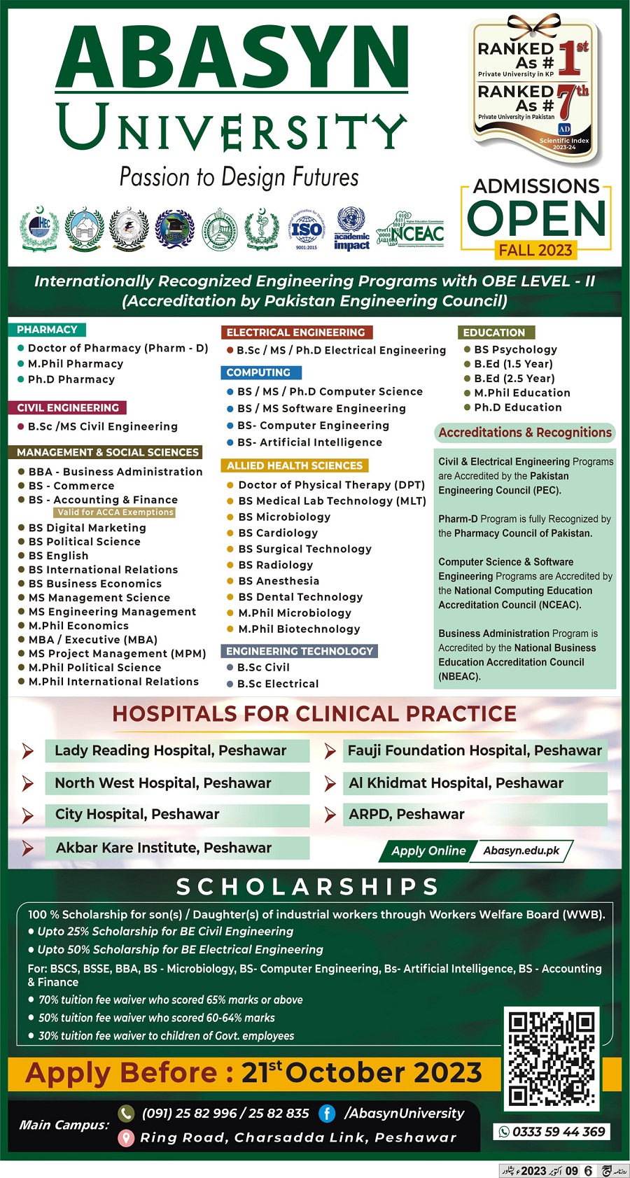 Admissions in ABASYN University 2023 for BS, MS, MPhil, PhD has been announced. Students can enroll for admissions in ABASYN University Peshawar Khyber Pakhtunkhwa KPK Pakistan for academic year 2023 to continue campus based or online education in Science University. Eligible candidates for admissions in Mphil, MS, BS and Phd can apply as per Private institute criteria and before closing date 15 November 2023 after reading advertisement online. Read newspaper ad for exact details.