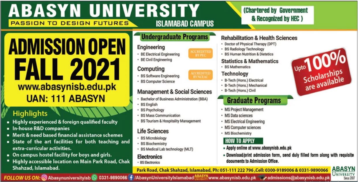 Abasyn University is a private sector university invites applications for admissions in Undergraduate Programs and Graduate Programs in Islamabad Campus 2021. Read newspaper ad for exact details.