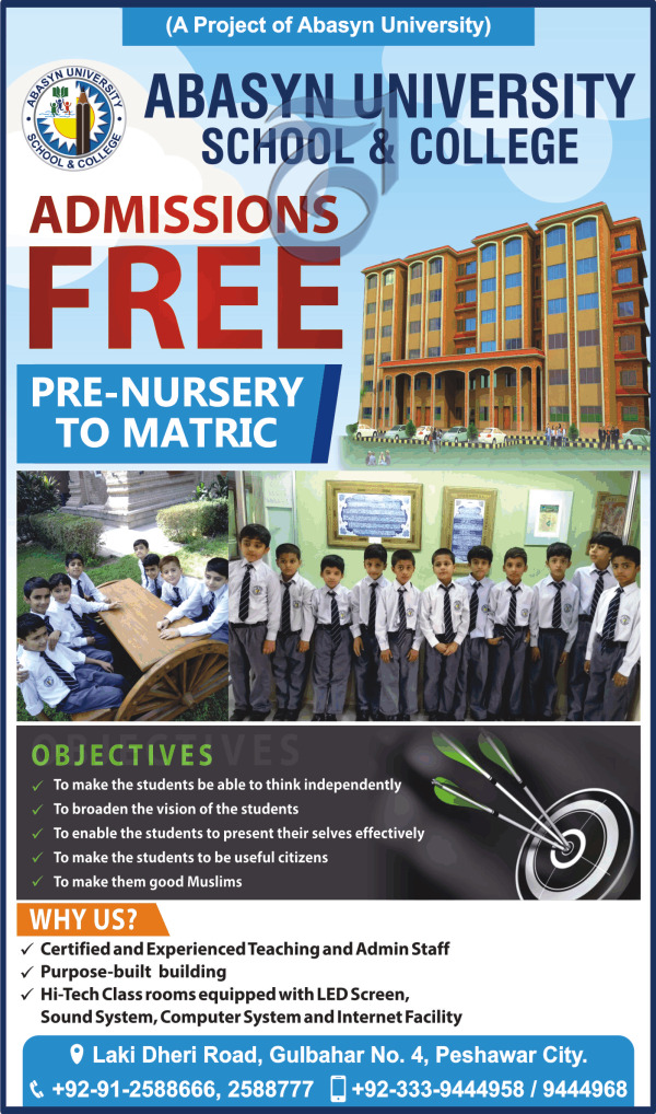 Abasyn University School & College Admission in Pre Nursery to Matric in Peshawar. A Project of Abasyn University. Admission Open for Both Male / Female Students Read newspaper ad for exact details.