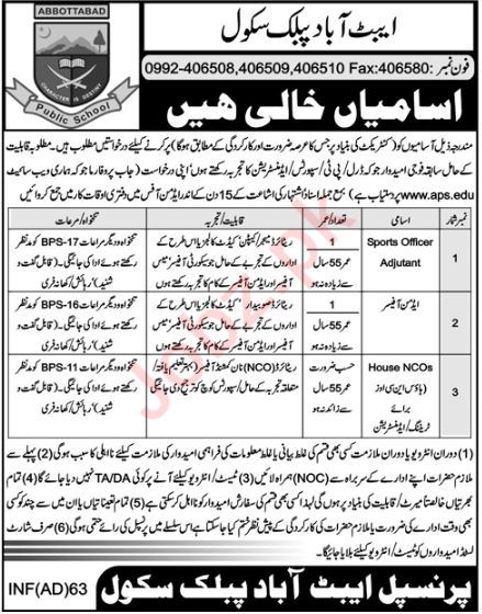 Vacant posts including house ncos, admin officer and sports officer adjutant are announced in Abbottabad Public School Abbottabad, abbottabad Khyber Pakhtunkhwa KPK Pakistan as per 18 June 2023 advertisement in daily Aaj Newspaper. Bachelor, Middle, Matric and Intermediate etc. educational qualification will be preferred.