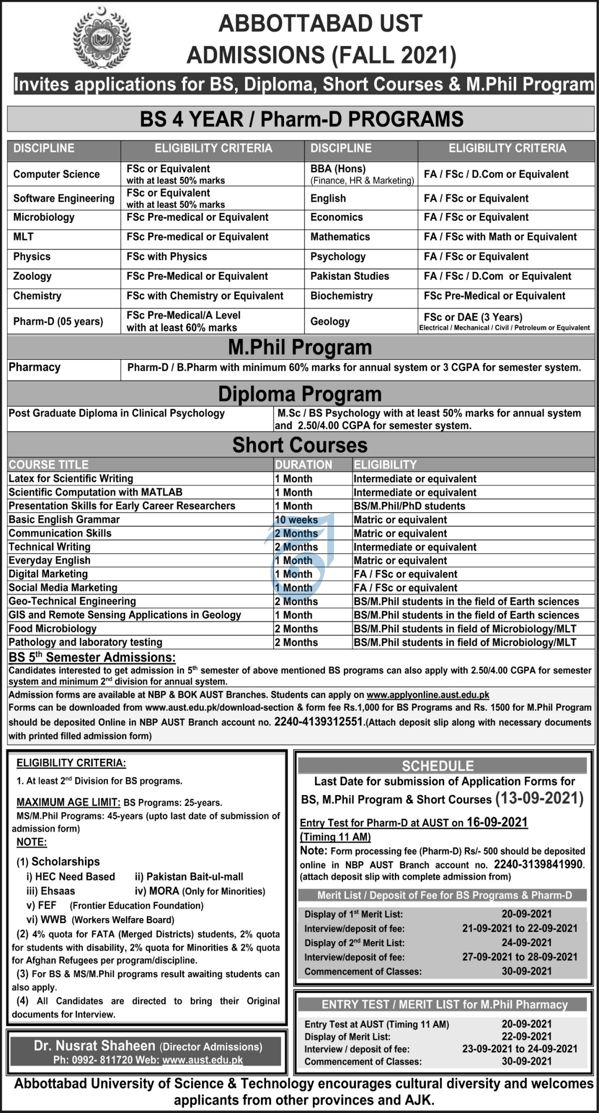 The Abbottabad University of Science and Technology is a public sector university has announced admissions in BS, Pharm-D, M.Phil, Diploma and Short Courses 2021. Read newspaper ad for exact details.