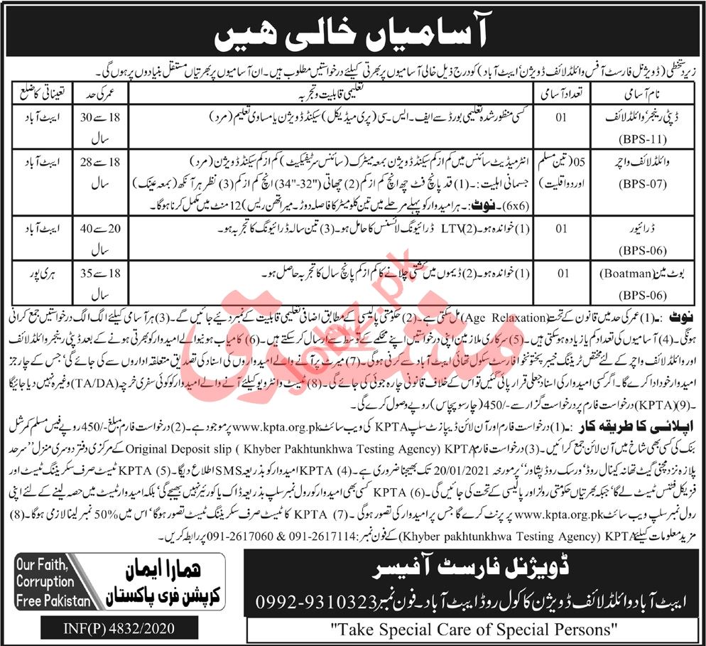 Abbottabad Wildlife Division, Forest and Wildlife Department, Government of the KPK needs candidates for the posts of Deputy Ranger Wildlife, Wildlife Watcher, Driver, LTV Driver, Boatman.