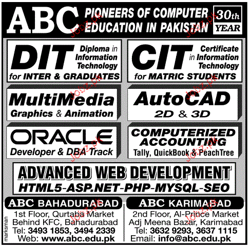 ABC Pioneers of Computer Education in Pakistan Admission in DIT, CIT and Autodad in Karachi. Read newspaper ad for exact details.