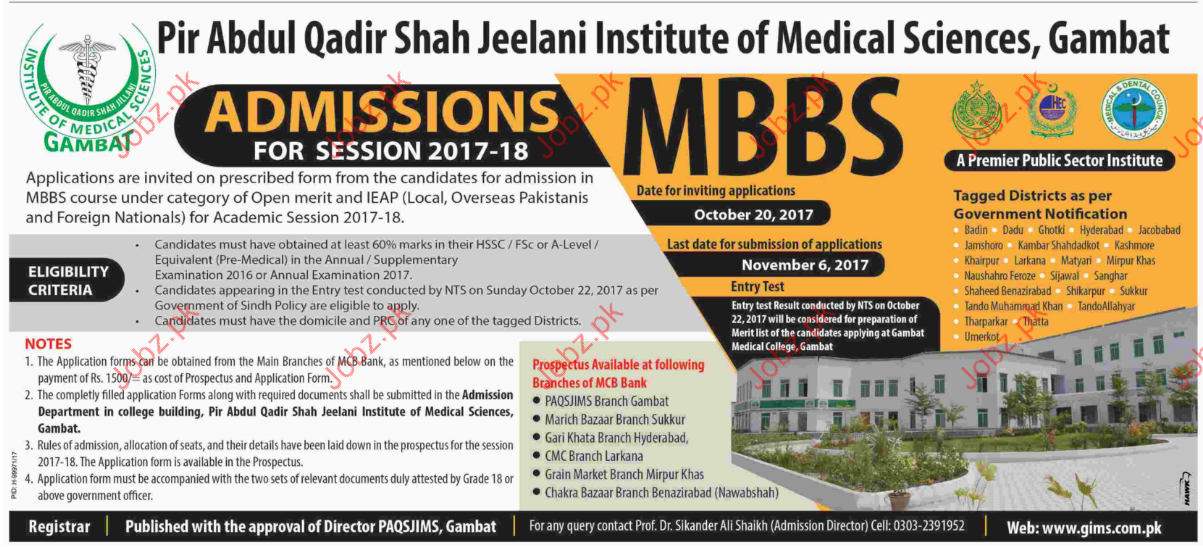 Pir Abdul Qadir Shah Jeelani Institute Of Medical Sciences has been open admissions of MBBS session 2017-18. Eligibility Criteria is that candidate must have obtained 60% Marks in HSSC, FSC or A levels exams. Read newspaper ad for exact details.