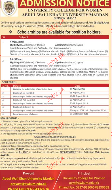 Abdul Wali Khan University Admission in BSc and BA in Mardan. Read newspaper ad for exact details.