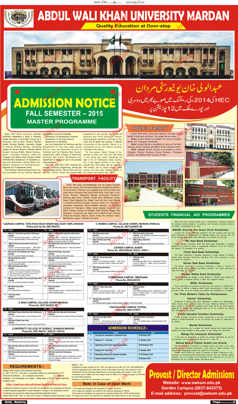 Abdul Wali Khan University Admission in Master Programs in Mardan. Read newspaper ad for exact details.