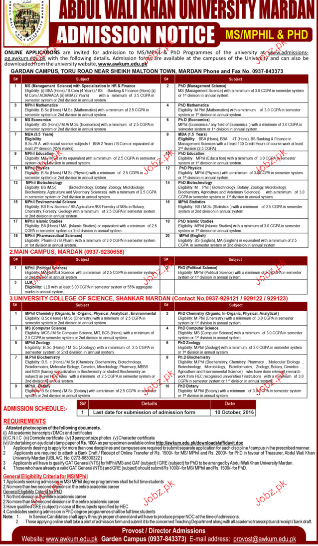 Abdul Wali Khan University Admission in MS/Mphill and Phd in Mardan. Read newspaper ad for exact details.