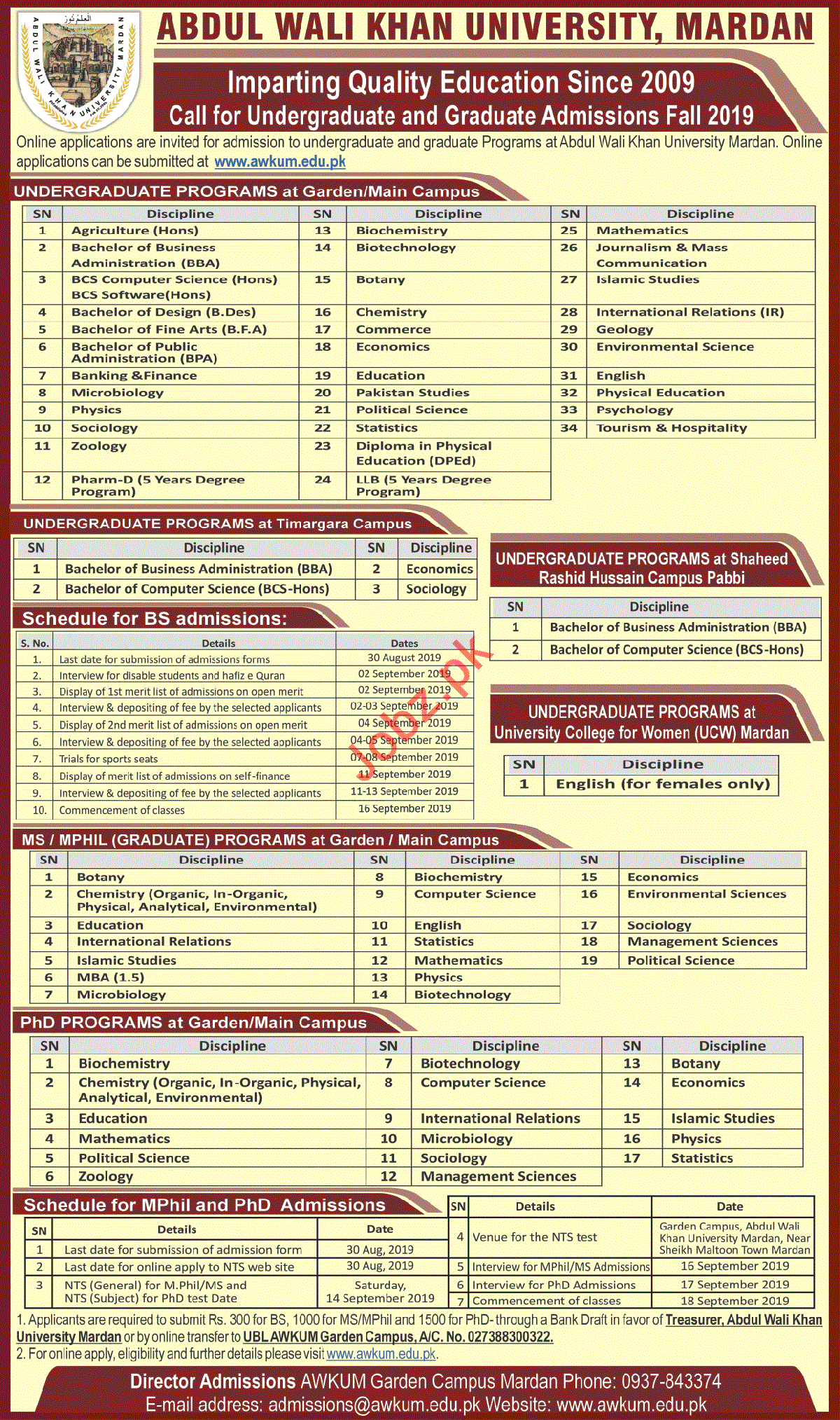 Online applications are invited for admissions in BS Agriculture, BBA, BCS, Bachelors of Design, Bachelor of Public Administration, Banking & Finance, Microbiology, Physics, Sociology, Zoology, Pharm-D, Mathematics, Journalism, Mass communication, IR, Environmental Science, BS English, Physical Education, Psychology, MS/MPHIL in Botany, Chemistry, Education, International Relations, Islamic Studies, MBA, Microbiology, Biochemistry, Computer Science, English, Statistics, Mathematics, Physics, Biotechnology, Economics, Management Science, PhD in Microbiology, Biochemistry, Computer Science, English, Statistics, Mathematics, Physics, Biotechnology, Economics, Management Science in Abdul Wali Khan University Mardan. Read newspaper ad for exact details.