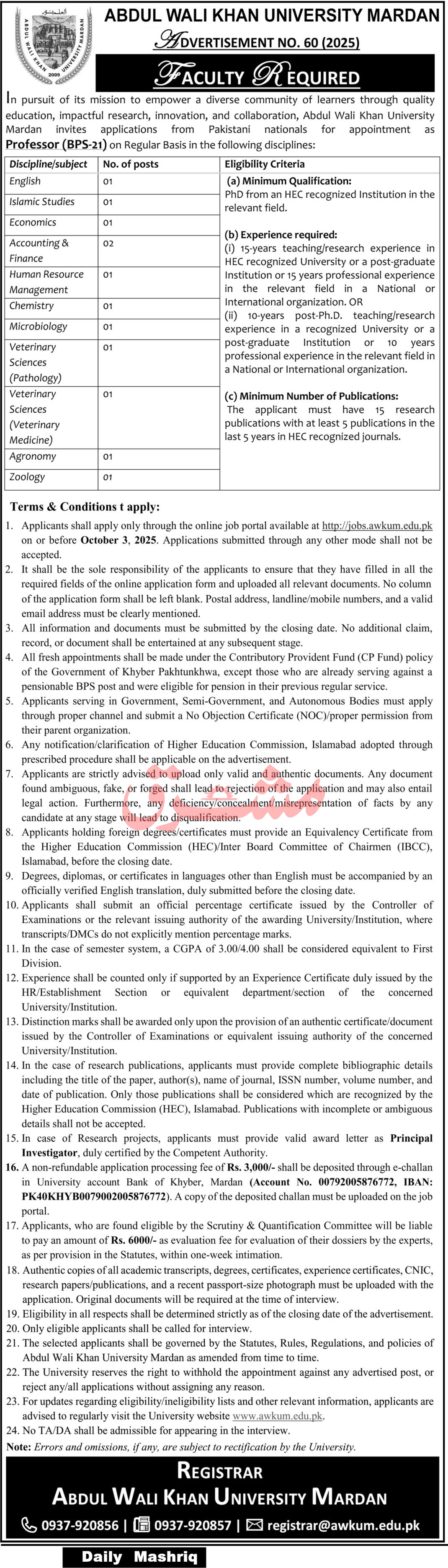 Abdul Wali Khan University is looking for candidates for following posts as per job advertisement published in daily Mashriq Newspaper of September 7, 2025 for location Shamsi Road Mardan, mardan Khyber Pakhtunkhwa KPK Pakistan: