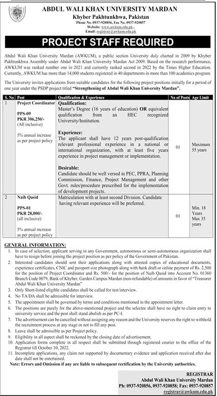 Vacancies in Abdul Wali Khan University Advertisement September 2022