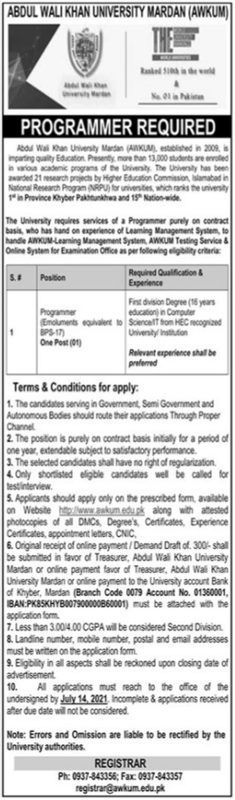 A well known Government Organization Abdul Wali Khan University AWKUM in Mardan is looking for qualified, expert and Well-Mannered staff for their Organization for the Job of Programmer with have a required education & experience of First division Degree (16 years education) in Computer Science/IT from HEC recognized University/Institution. Relevant experience shall be preferred.