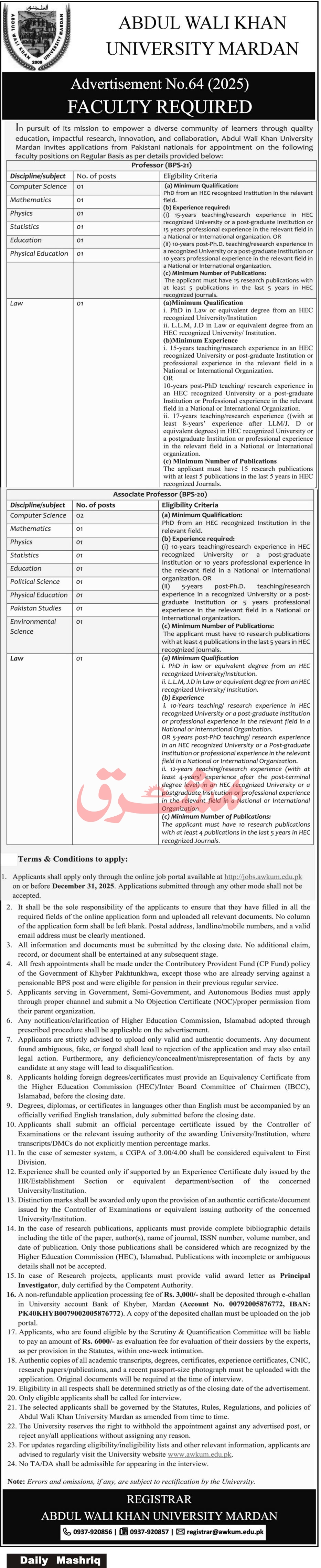 Abdul Wali Khan University jobs advertisement dated about 3 December 2025 in daily Mashriq Newspaper invites application for the vacant post of professor and associate professor in Mardan, mardan Khyber Pakhtunkhwa KPK Pakistan. Persons with Bachelor, Mphil, Phd and Master etc. education can apply.