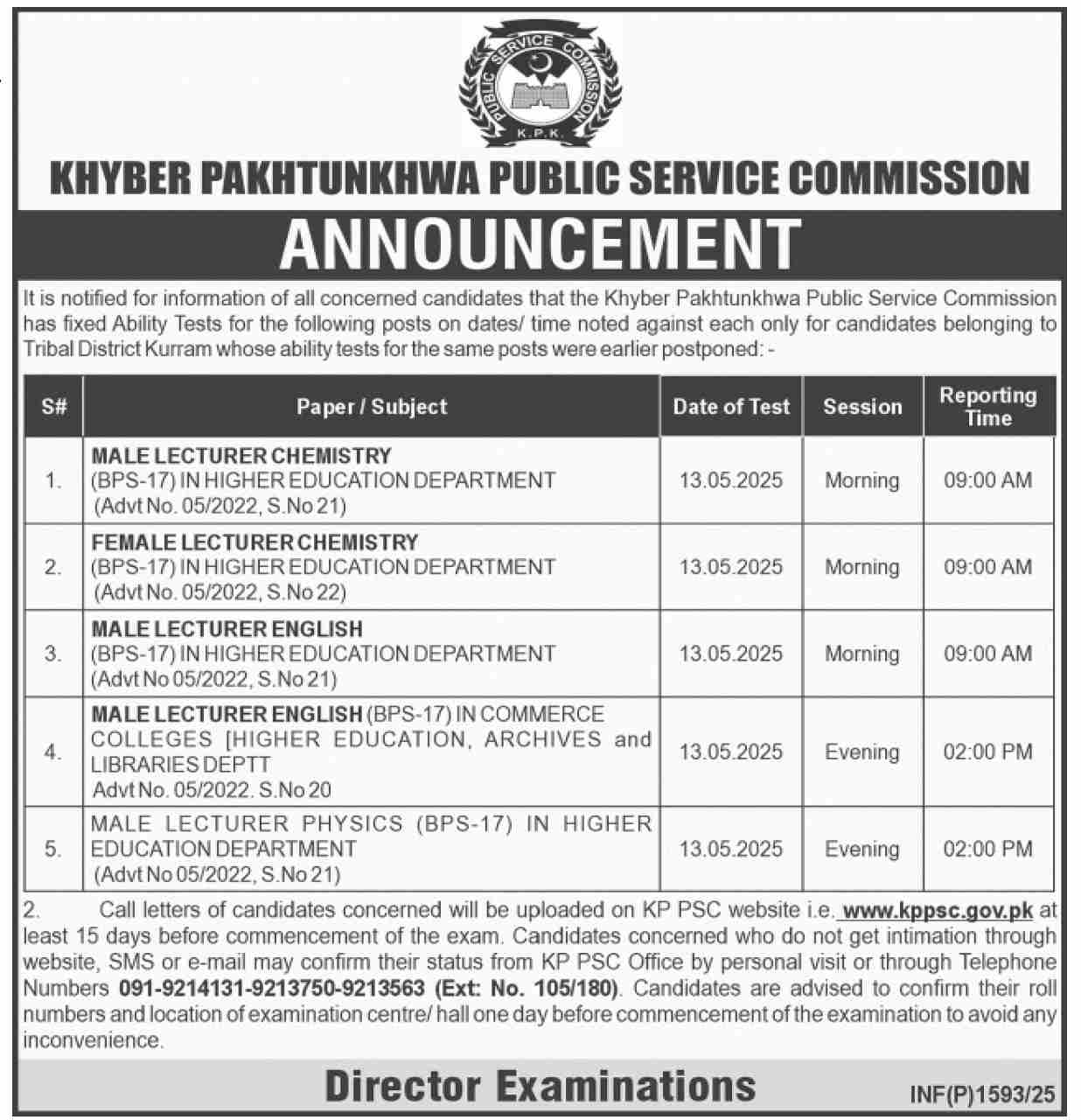 Khyber Pakhtunkhwa Public Service Commission KPPSC jobs advertisement dated about 26 April 2025 in daily Dawn Newspaper invites application for the vacant post of female lecturer chemistry, male lecturer english, male lecturer physics and male lecturer chemistry in Kurram, kurram Khyber Pakhtunkhwa KPK Pakistan. Persons with Bachelor and Master etc. education can apply.