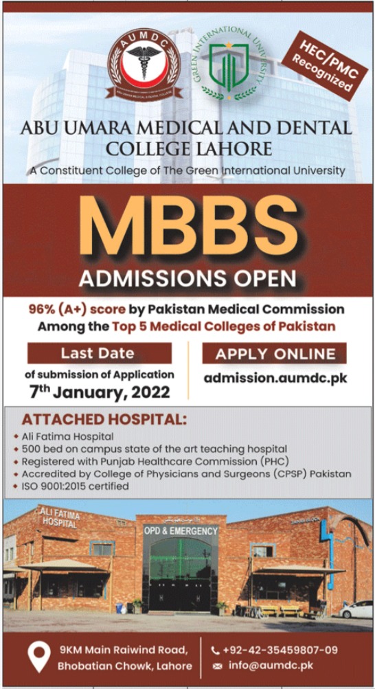 Abu Umara Medical & Dental College Lahore is offering admissions in the program of MBBS for students who got qualified with good marks and percentage in FSc Medical. Apply before last date. Read newspaper ad for exact details.