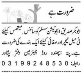 Vacant posts including mathematics teacher, female teacher, teacher, sweeper and science teacher are announced in Abubakar Siddiq Education System Circular Road Peshawar, peshawar Khyber Pakhtunkhwa KPK Pakistan as per 7 August 2025 advertisement in daily Express Newspaper. Educational qualifications required M.sc, Bachelor, Primary, MA, Others and Master etc.