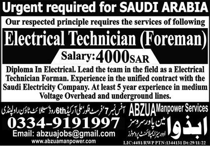Abuza Manpower Services jobs advertisement dated about 4 December 2022 in daily Express Newspaper invites application for the vacant post of electrical technician in Riyadh, riyadh Saudi Arabia. Persons with Primary, Middle and Matric etc. education can apply.