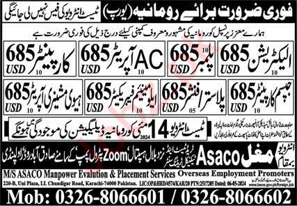 Vacant posts including electrician, ac operator, gypsum carpenter, carpenter, aluminium fabricator, heavy machinery operator, plasterer and plumber are announced in MS Asaco Manpower Evaluation & Placement Services OEP Romania, romania Romania as per 13 May 2024 advertisement in daily Express Newspaper. Educational qualifications required Matric, Middle and Intermediate etc.