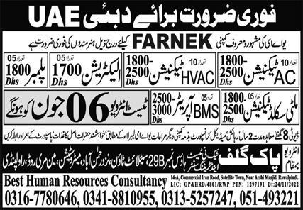 Vacant posts including electrician, hvac technician, plumber, multi skilled technician, bms operator and ac technician are announced in Best Human Resources Consultancy UAE, dubai UAE as per 5 June 2023 advertisement in daily Express Newspaper. Educational qualifications required Intermediate, Matric and Middle etc.