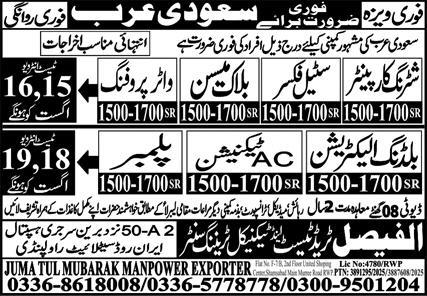 Juma Tul Mubarak Manpower Exporter Riyadh, taif Saudi Arabia invites applications from eligible candidates for the post of steel fixer, shuttering carpenter, water proofing technician, ac technician, plumber, building electrician and block mason as per advertisement of August 15, 2025 published in daily Express Newspaper. Educational qualifications required Intermediate and Matric etc.