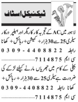 Manufacturing Company jobs advertisement dated about 18 March 2022 in daily Jang Newspaper invites application for the vacant post of technician, helper and ac technician in Lahore, lahore Punjab Pakistan. Educational qualifications required Matric and Middle etc.