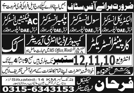 Farhan Technical Training Center Multan Road Lahore, lahore Punjab Pakistan invites applications from eligible candidates for the post of data entry operator, ac technician instructor, civil instructor, carpenter instructor, cook, electrical instructor, plumber instructor and computer operator as per advertisement of September 10, 2025 published in daily Express Newspaper. Preferred Education is Middle, BA, Matric, DAE, Bachelor and Intermediate etc.