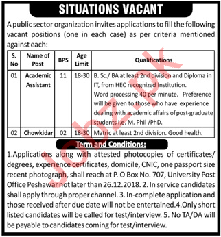 Academic Assistant & Chowkidar Jobs 2019 In Peshawar KPK