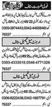 Apply as per details in job advertisement. Login to view further details of how to apply via https://www.jobz.pk online.