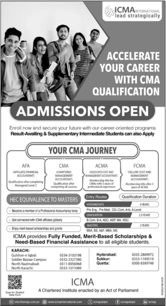 Institute of Cost & Management Accountants of Pakistan ICMA admissions 2024 for Affiliate Financial Accountant AFA, Chartered Management Accountant CMA, Associate Cost and Management Accountant ACMA, Fellow Cost and Management Accountant FCMA has been announced. Students who want to take admissions in Institute of Cost & Management Accountants of Pakistan ICMA Karachi , Quetta, Hyderabad and Sukkur Sindh Pakistan for academic year 2024 to continue education in Management University can apply. Students for admissions in Master, CA, ACCA and Bachelor can apply for online or campus classes as per Government institute criteria till admission closing date May 27, 2024. Read newspaper ad for exact details.