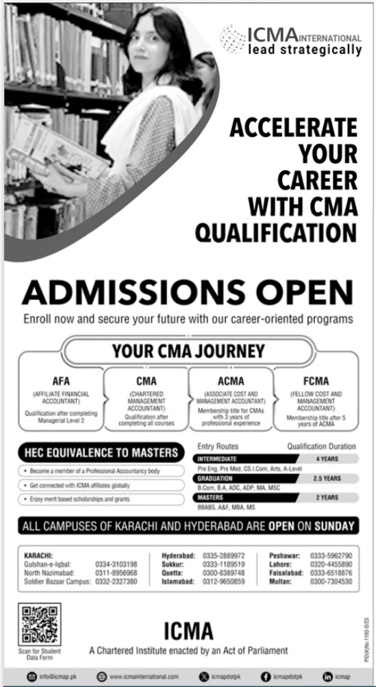Institute of Cost and Management Accountants of Pakistan ICMAP Affiliate Financial Accounting AFA, Certified Management Accountant CMA, Associate Cost and Management Accountant ACMA, Fellow Cost and Management Accountant FCMA admissions 2023 has been announced. Students can enroll for admissions in Institute of Cost and Management Accountants of Pakistan ICMAP Karachi Faisalabad, , Peshawar, Islamabad, Lahore, Quetta, Hyderabad, Multan and Sukkur Sindh Pakistan for academic year 2023 to continue campus based or online education in Science University. Students for admissions in Others, ACCA and CA & criteria can apply as per Government institute admission policy 2023 before closing date November 22, 2023 as per advertisement. Read newspaper ad for exact details.