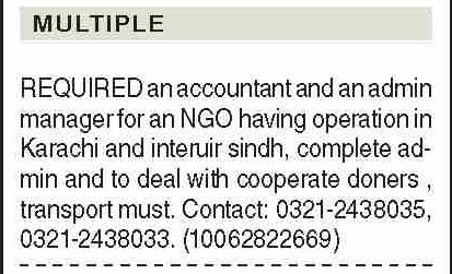 Non Governmental Organization NGO is looking for candidates for following posts as per job advertisement published in daily Dawn Newspaper of September 8, 2025 for location Karachi, karachi Sindh Pakistan:
