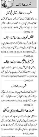 Private Company is looking for candidates for following posts as per job advertisement published in daily Dunya Newspaper of January 5, 2024 for location Karachi, lahore and karachi Sindh Pakistan: