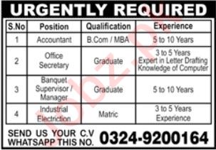 Private Sector Karachi, karachi Sindh Pakistan invites applications from eligible candidates for the post of banquet supervisor, accountant, industrial electrician, office secretary and manager as per advertisement of November 13, 2022 published in daily Jang Newspaper. B.com, MBA, Matric and Bachelor etc. educational qualification will be preferred.