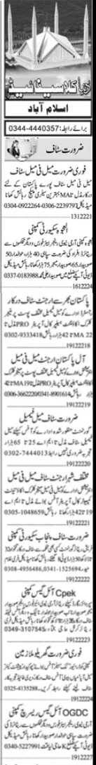Vacant posts including accountant, helper, clerk, office boy, retired subedar major, patient care helper, manager, retired sepoy, retired major, call operator, male aya, chowkidar, male female staff, retired government staff, cook, retired havaldar, pro, office staff, retired subedar and management staff are announced in Private Islamabad, islamabad Islamabad Pakistan as per 19 December 2022 advertisement in daily Dunya Newspaper. Educational qualifications required Bachelor, Middle, Intermediate, Master and Matric etc.